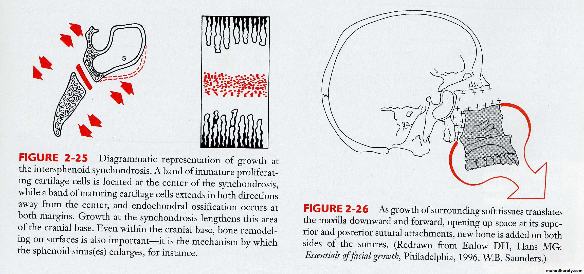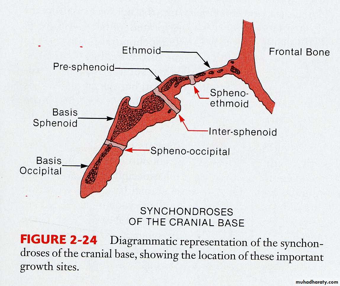 Endochondral growth occurs within the synchondrosesGrowth at the synchondroses lengthens the area of the cranial base