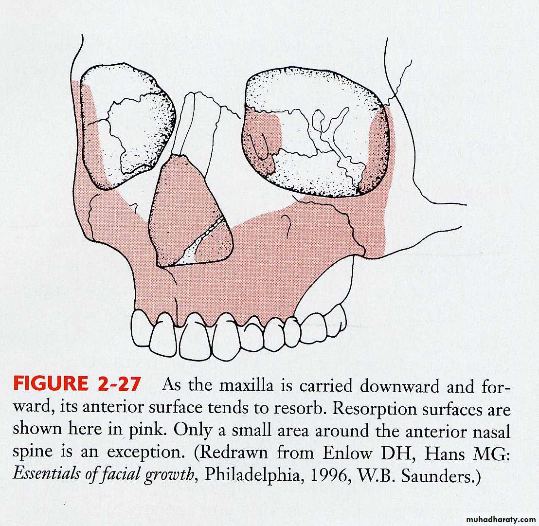 Bone in the anterior surface of the maxilla is resorbedApposition of bone occurs at the maxillary tuberosity