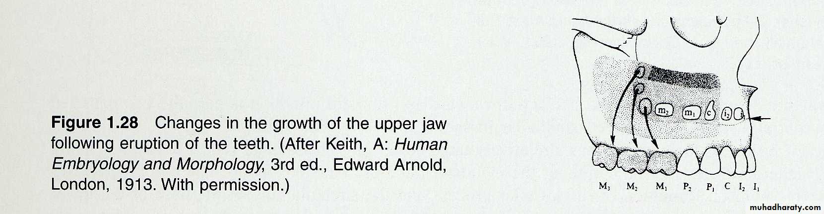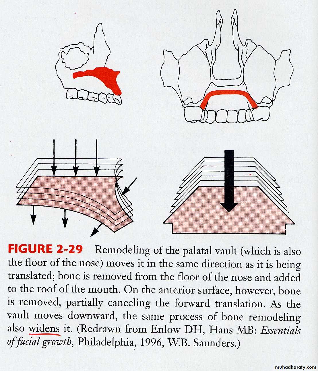 Apposition of bone occurs at the palate and alveolar processAs a result, palate moves mostly downward and widens transversely