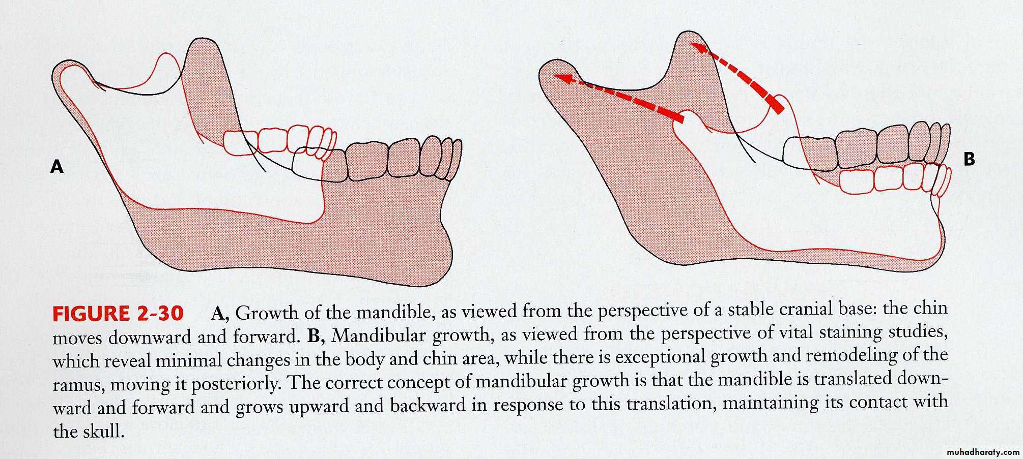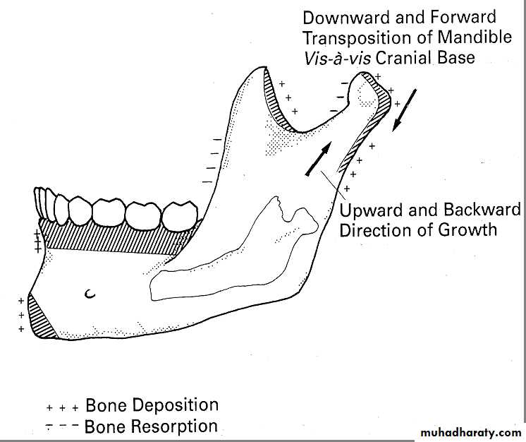 Mandible is translated downward and forward- away from cranial basePrincipal sites of growth: posterior surface of ramus and the condylar and coronoid processes