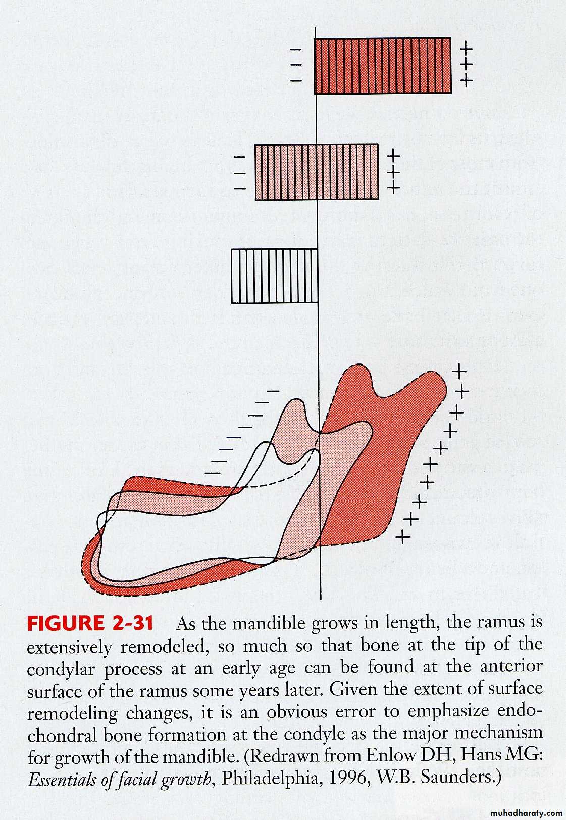 Endochondral growth occurs at the cartilage that covers the mandibular condyleAll other areas grow by surface apposition and remodeling