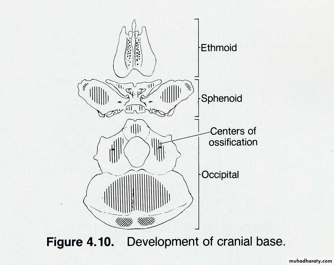 Ossification centers result in ethmoid, sphenoid and basi-occipital bones.