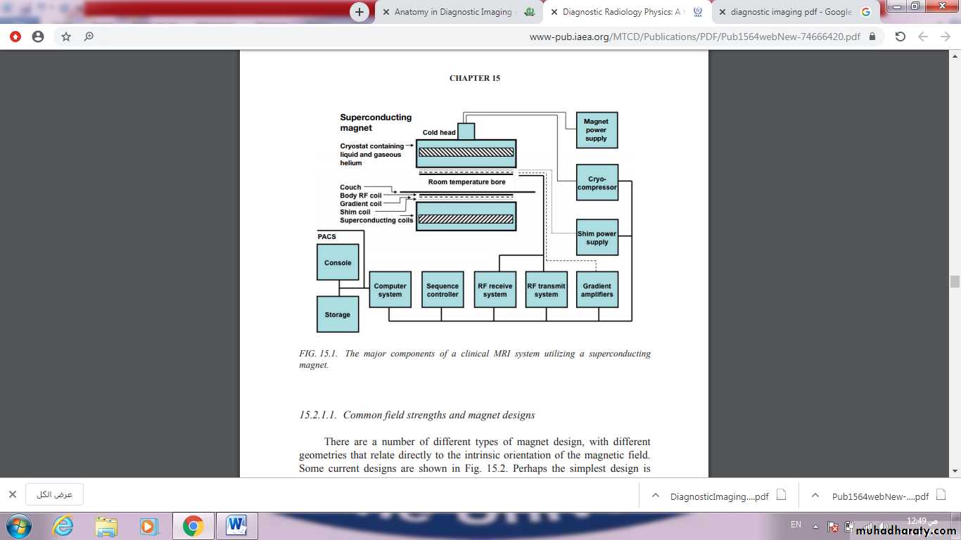 MRI systems comprise a number of major hardware components, under the control of digital systems that provide instructions, monitor system performance and acquire and process the signals that are used to create images or spectroscopic signals reporting on a wide range of tissue states. These systems are coordinated by one or more computer workstations or PCs that provide the interface to the MR operator, enabling acquisitions to be planned and executed, and images to be calculated, displayed and stored, often providing sets of measurement and analysis software addressing particular clinical questions. The next figure shows the major components of an MRI system, and these are described in more detail below.