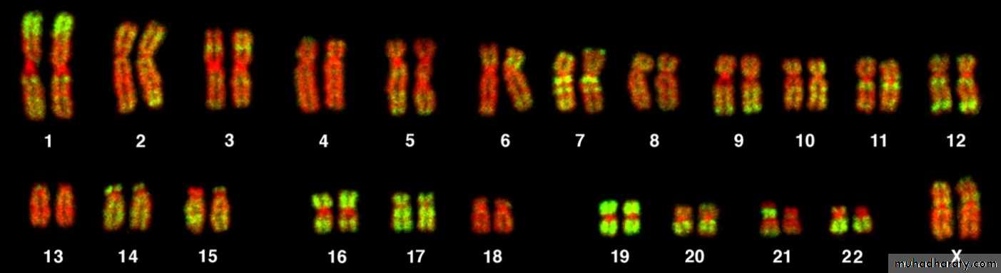 Human karyotype “painted” using fluorescent DNA probes. These mitotic chromosomes each consist of a pair of sister chromatids joined at their centromeres. The images of the homologous chromosome pairs (e.g., 2 copies of chromosome 1) have been lined up next to each other.