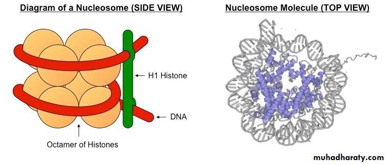 A nucleosome consists of 147 base pairs of DNA that is enfolded around a set of 8 histones called an octomer. The nucleosome can be further folded to produce the chromatin fiber. Chromatin fibers are coiled and condensed to form chromosomes. Chromatin makes it possible for a number of cell processes to occur including DNA replication, transcription, DNA repair, genetic recombination, and cell division.