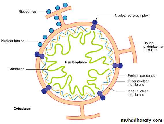 The nucleus is separated from the cytoplasm by a double membrane, known as the nuclear envelope, this envelope consist of two layers, outer layer is the layer of protein fibers called the nuclear lamina which associated with the inner layer.Functions of nuclear lamina: