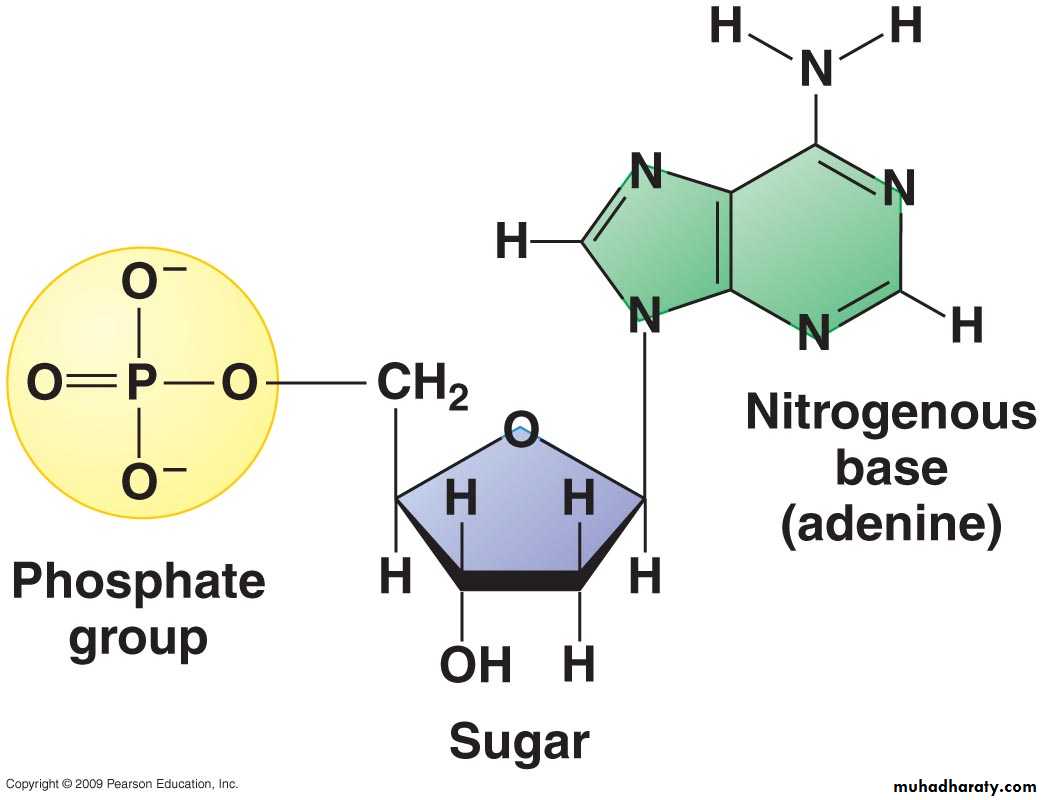 • Each nucleotide contains one phosphate group, one pentose or deoxypentose sugar, and one purine or pyrimidine base.• In DNA the sugar is D-2-deoxyribose; in RNA the sugar is D-ribose.