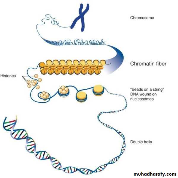 Chromatin is a complex of macromolecules composed of DNA, RNA, and protein, which is found inside the nucleus of eukaryotic cells. Chromatin exists in two forms: heterochromatin (condensed) and euchromatin (extended). The primary protein components of chromatin are histones that help to organize DNA into “bead-like” structures called nucleosomes by providing a base on which the DNA can be enfolded around.