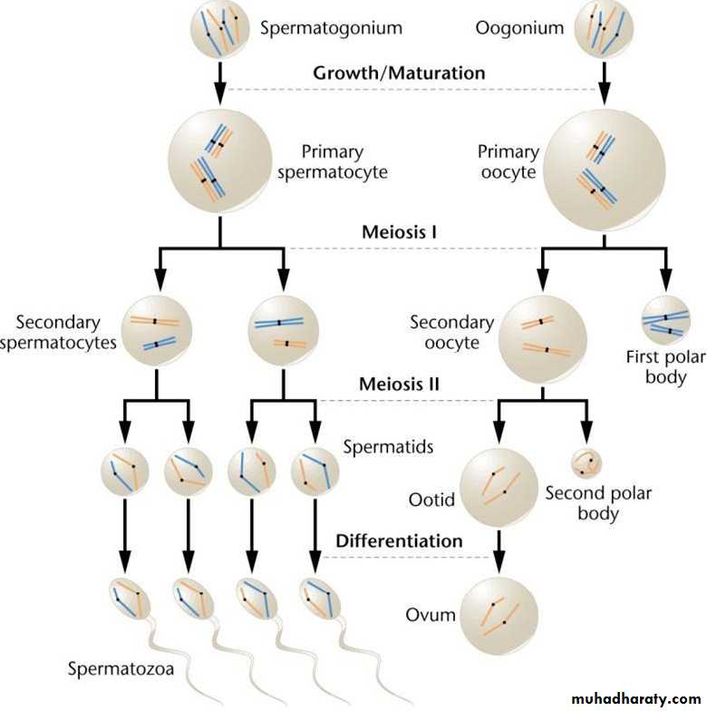 two haploid cells are formed a diploid cell, these diploid cells are Oogonia in females and the Spermatogonia in males.Following meiosis I, a second meiosis, the equational division, take place, and each haploid cell is replicated.