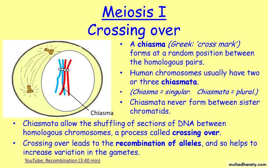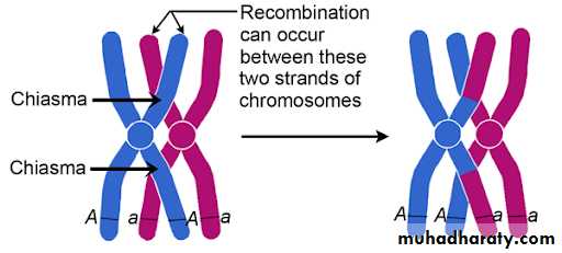 A second feature of prophase I is the formation of chiasmata (plural of chiasma), each chiasma indicates a point at which the homologous chromosomes (non-sister chromatids) exchange genetic material, this process called crossing over, produces chromosomes consisting of combinations of parts of the original chromosomes which leads to increase the genetic variation in gametes.