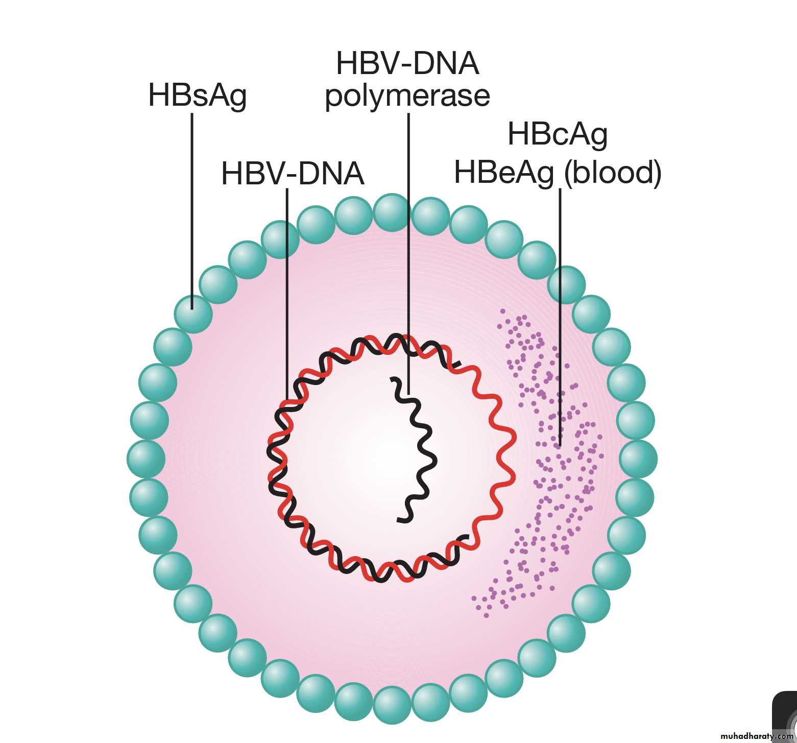 . Virus contains 3 important HBV antigens