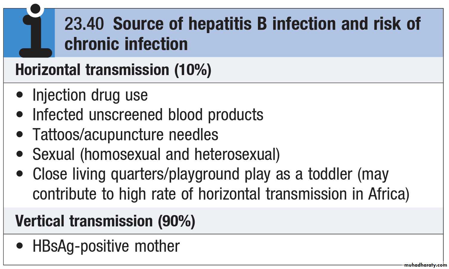 Hepatitis B is transmitted through exposure to body fluids containing the virus:• Perinatal is the most common cause of infection world wide and carries high risk of chronic infection.