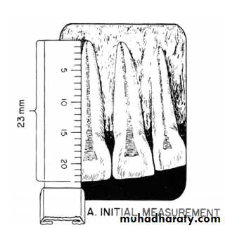 8. Set the endodontic ruler at this new corrected length and readjust the stop on the exploring instrument.9. Because of the possibility of radiographic distortion, sharply curving roots, and operator measuring error, a confirmatory radiograph of the adjusted length is highly desirable.