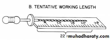 Method:1. Measure the tooth on the preoperative radiograph.2. Subtract at least 1.0 mm “safety allowance” for possible image distortion or magnification.3. Set the endodontic ruler at this tentative working length and adjust the stop on the instrument at that level .4. Place the instrument in the canal until the stop is at the plane of reference unless pain is felt (if anesthesia has not been used), in which case, the instrument is left at that level and the rubber stop readjusted to this new point of reference.No. 13