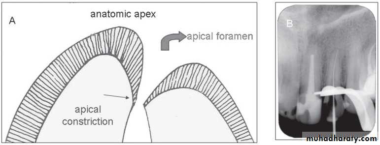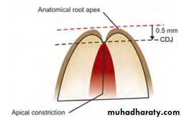 The apical constriction is the apical portion of the root canal having the narrowest diameter. This position may vary but is usually 0.5 to 1.0 mm short of the center of the apical foramen.No. 7