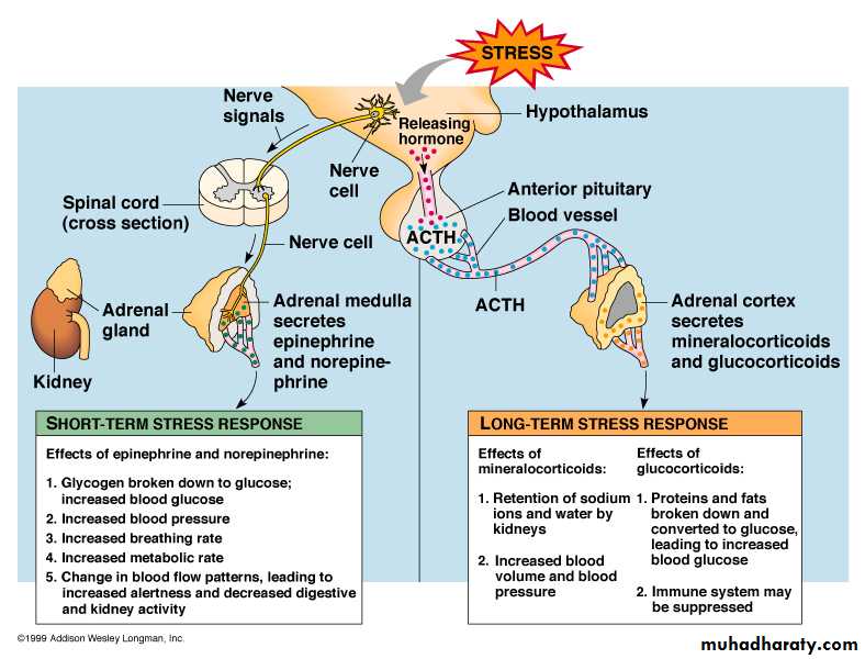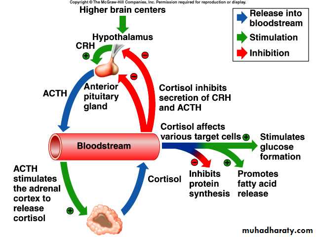 Stress stimuli activate the entire control system to cause rapid release of cortisol & the cortisol in turn initiates a series of metabolic effects .there is direct feedback of the cortisol to both the hypothalamus & the anterior pituitary to decrease the concentration of cortisol in plasma .The secretory rate of CRF, ACTH & cortisol are high in early morning but low in the late evening .