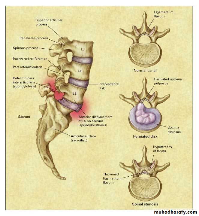 The pain is gradual & often occur before the age of 30, associated with morning stiffness & improves rather than worsening with activity.4- radicular(nerve root) pain: sever& sharp. It radiates down below knee & aggravated by cough, sneezing & straining rather than by back movement. It manifested by parasthesia & reduced straight leg rising which reproduce leg pain.