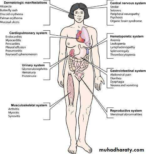Other manifestations of SLE like fever, Wt loss & lymphadenopathy commonly accompany active disease. GIT involvement is rare. Chronic fatigue &other features of fibromayalgia affect up to 80% of patients. These features are unresponsive to steroids but can be managed with low dose amitriptyline& graded exercise therapy.