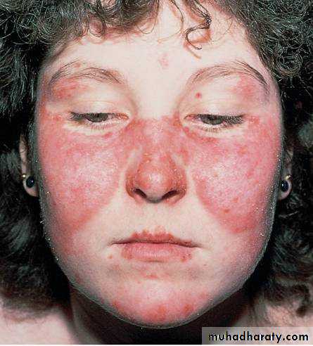 Mucocutaneous features: painful oral ulcers are common in SLE. Diffuse non-scarring alopecia is common, & indicate active disease.