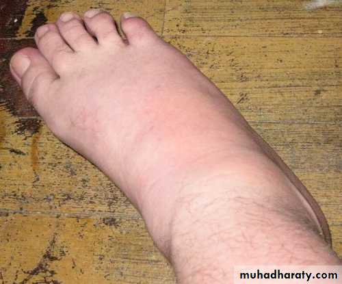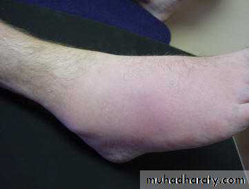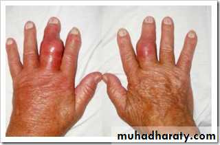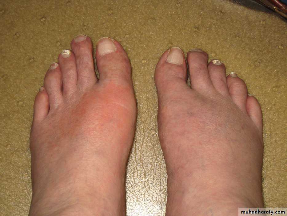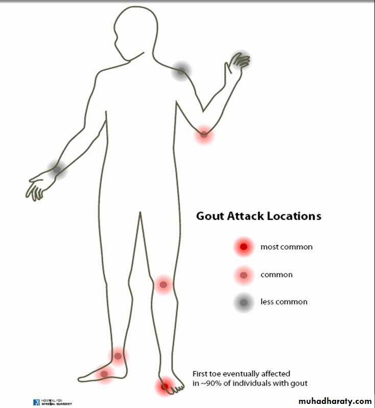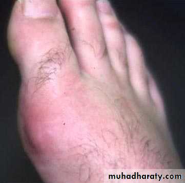 Clinically, gout may present as asymptomatic hyperuricemia, acute arthritis, chronic arthritis, or chronic tophaceous gout.Attacks of pain are rapid in onset, waking the patient in early morning. Single distal joint is often affected(first metatarsal joint- podagra) , but eventually other joints are affected. The pain is associated with extreme tenderness that the patient is unable to wear a sock. The swelling is marked with overlying shiny red skin. Complete resolution of swelling & pain occur in 5-14 days.