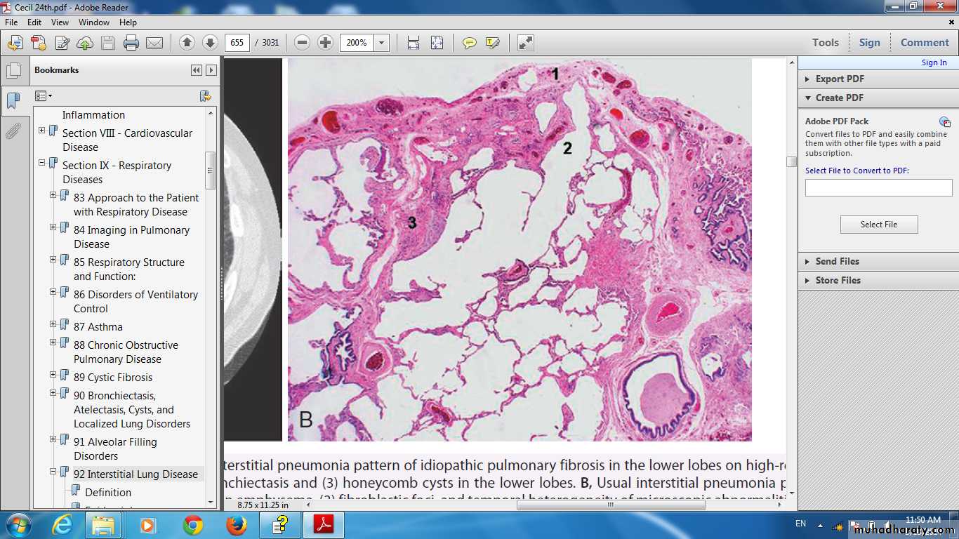 secondary pulmonary hypertension.Usual interstitial pneumonia pattern of idiopathicpulmonary fibrosis. Note the presence of (1) subpleural fibrosis (2) traction emphysema, (3) fibroblastic foci, and temporal heterogeneity of microscopic abnormalities at low magnification