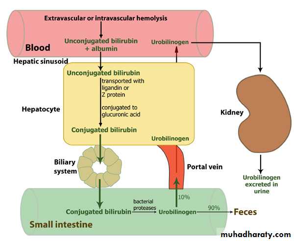 Bilirubin is the end product of haem degradation. Some 70–90% of bilirubin is derived from degradation of the hemoglobin of senescent red blood cells and the reminder from hemeprotein such as mygloblin and cytochromes enzyme .Unconjegated bilirubin is water-insoluble ,it is bound to albumin and does not pass into urine .it is transported to the liver by carrier mediated kinetic .within the hepatocyte .bilirubin is conjugated with one or two glucuronic acid by specific glucuronyl transferase to form bilirubin mono- and di- glucuronid, respectively, these conjugated bilirubin are water-soluble and exported into the bile by specific carrier on the hepatocyte membrane.