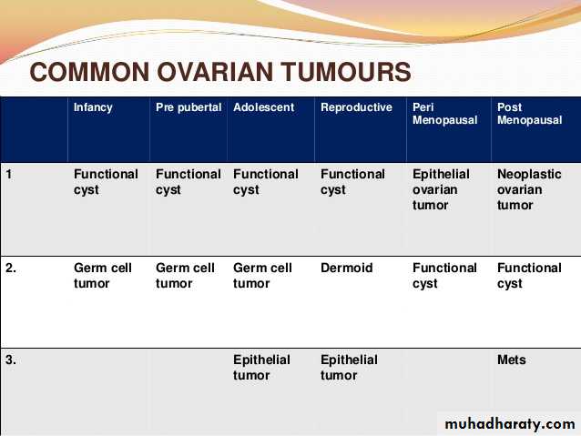 Often bilateral (15 -25%) GROSS: thick, opaque , whitish wall. CONTENTS: hair, bone, cartilage, and a large amount of greasy sebaceous material. MICROSCOPICALLY : all the three germ layers (ectoderm, mesoderm and endoderm) Malignant change occurs in 1-3%. Usually of a squamous type. Risk of torsion is 15% An ovarian cystectomy is almost always possible, even if it appears that only a small amount of ovarian tissue remainsFIBROMA