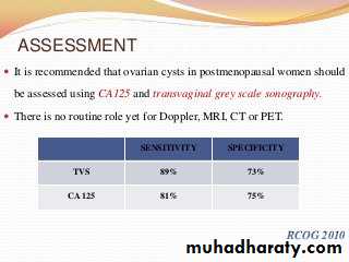 It is recommended that ovarian cysts in postmenopausal women should be assessed using CA125 and transvaginal grey scale sonography. There is no routine role yet for Doppler, MRI, CT or PET