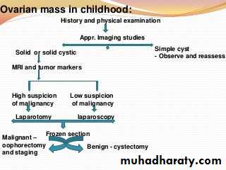 Any solid ovarian lesion Any ovarian lesion with papillary vegetation on the cyst wall Any adnexal mass >10cm in diameter Palpable adnexal mass in a premenarchal or postmenopausal women Torsion or rupture suspected