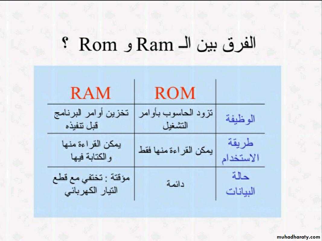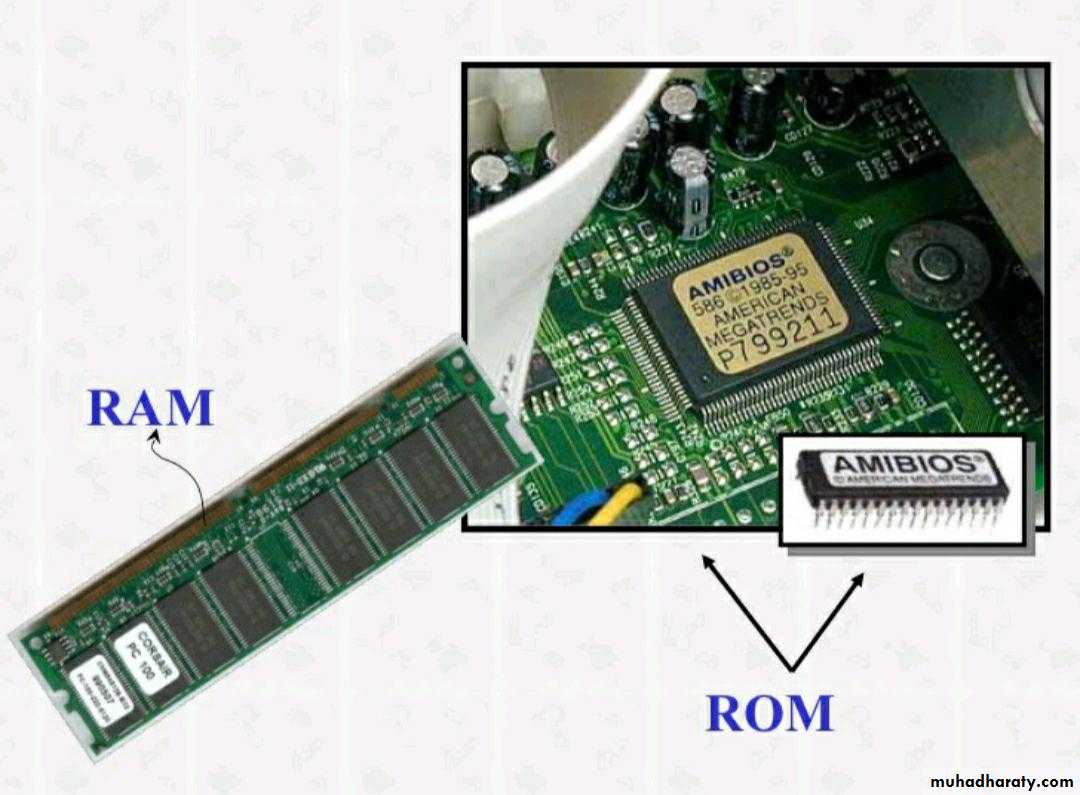 ب- ذاكرة القراءة فقط (ROM) )تقوم هذه الذاكرة بتخزين برامج التشغيل والبرامج الأساسيّة التي تقوم بتشغيل جهاز الكمبيوتر، وهذه الذاكرة لا يمكن التعديل عليها أو محوها لأنها مخزَّنة من الشركة المصنّعة الرئيسة، ولا يمكن لجهاز الكمبيوتر أن يعمل من دون هذه الذاكرة، كما أنّها لا تتأثر بانقطاع التيار الكهربائي عن الجِهاز، بل يمكن استعادة بياناتها عند تشغيل الجِهاز مرةً أخرى