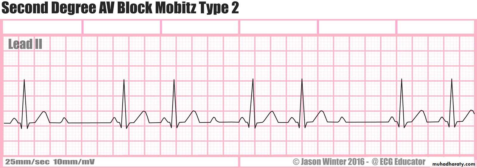- It is less common than second degree type I , it is more serious than type I , it can suddenly progress to third degree ( complete block ) .Causes: ( acute MI , drugs such as digoxin , beta blocker , verapamil )