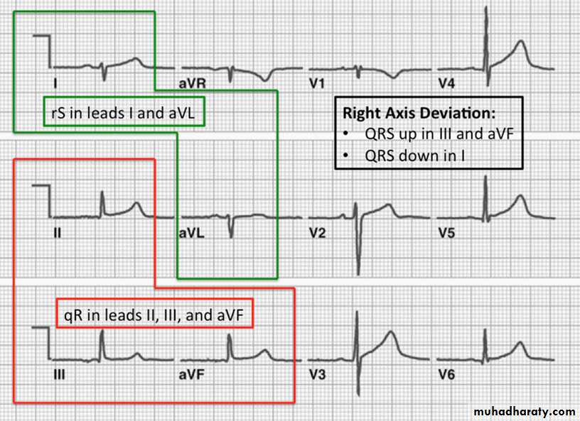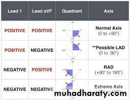2- Right axis deviation : negative QRS in lead 1 and positive in lead aVF3- Left axis deviation : positive QRS in lead 1and negative in lead aVF