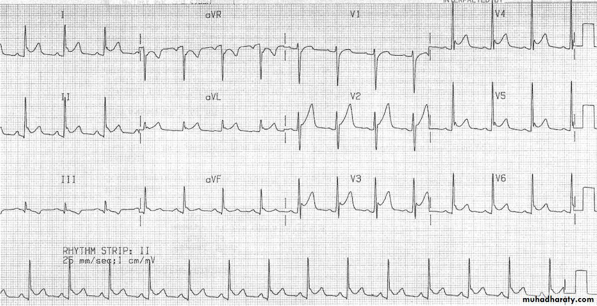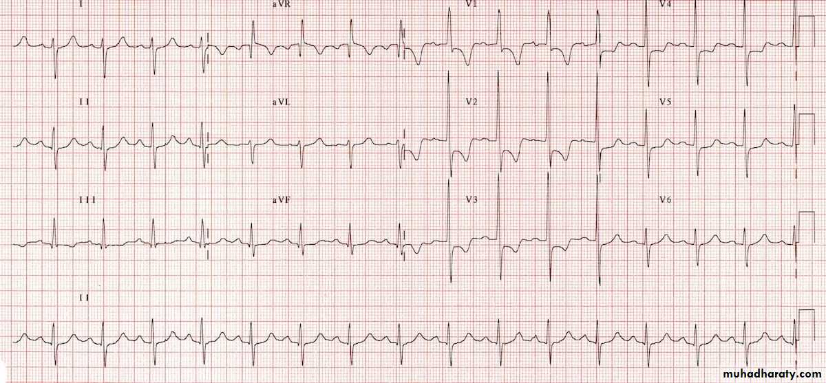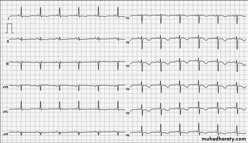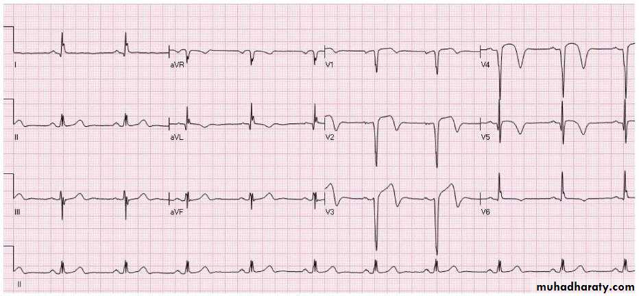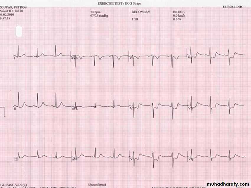 Findings : ( S-T depression in V2,3,4,5,6 , I , II , a V L )