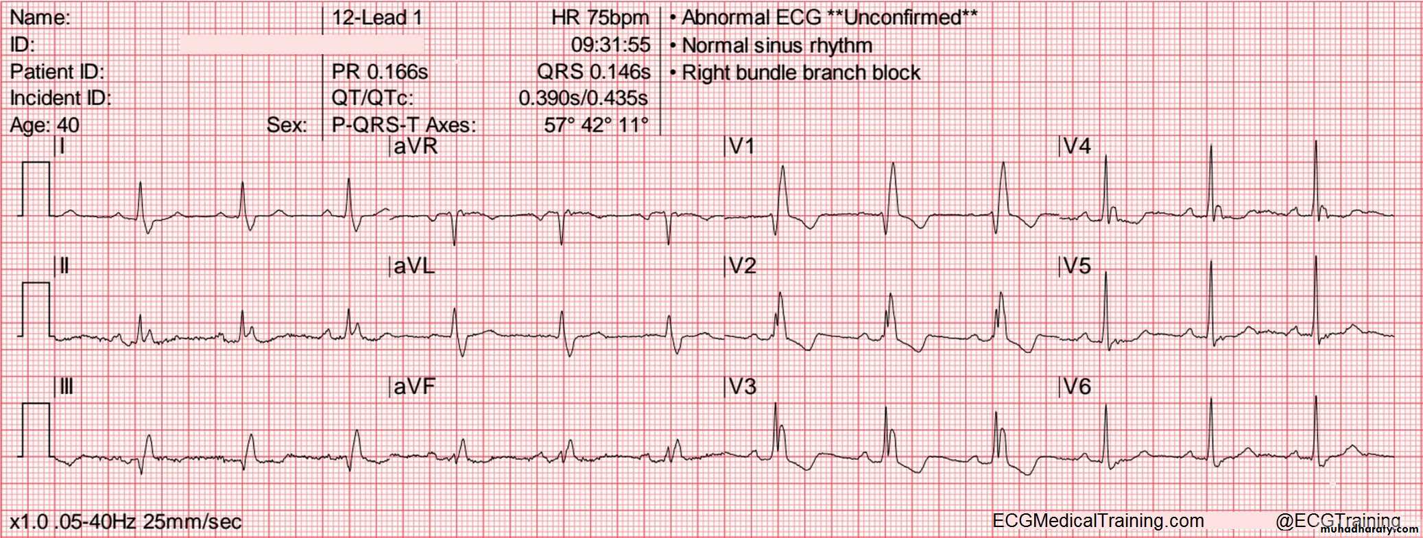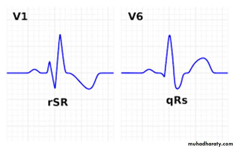 - normally in ECG after P wave there is negative ( Q wave – positive R wave – negative S wave ) , in RBBB in V1 after the P wave there is ( positive r wave – negative S wave – positive R wave )