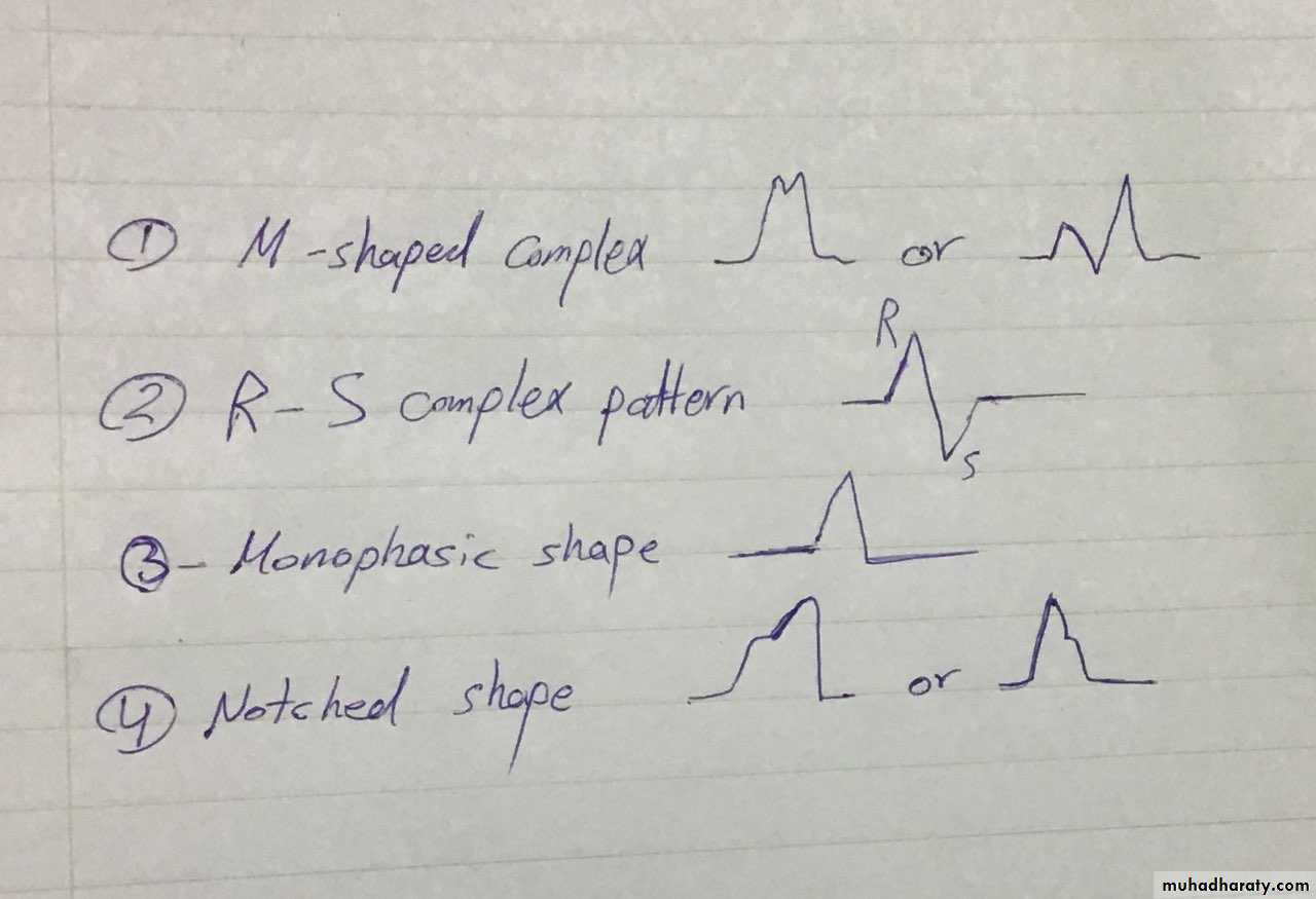 Complex in lateral leads ( I , a V L , V5 ,V6 ) gives either M shape ,R S pattern , monophasic shape , notched shape )