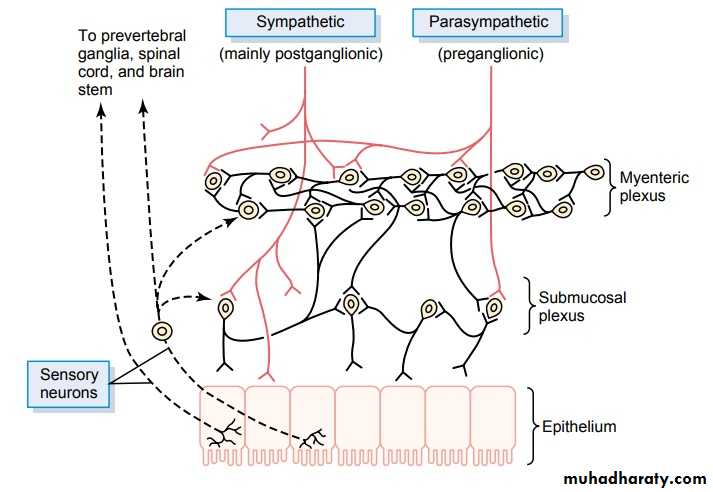 The gastrointestinal tract has a nervous system all its own called the enteric nervous system. It lies entirely in the wall of the gut, beginning in the esophagus and extending all the way to the anus. The number of neurons in this enteric system is about 100 million, nearly equal to the number in the entire spinal cord. This highly developed enteric nervous system is especially important in controlling gastrointestinal movements and secretion.The enteric nervous system is composed mainly of two plexuses, shown in Figure below: (1) an outer plexus lying between the longitudinal and circular muscle layers, called the myenteric plexus or Auerbach’s plexus, and (2) an inner plexus, called the submucosal plexus or Meissner’s plexus, which lies in the submucosa.