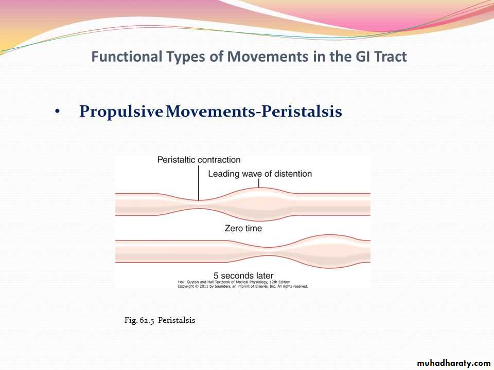 Two types of movements occur in the gastrointestinal tract: (1) propulsive movements, which cause food to move forward along the tract at an appropriate rate to accommodate digestion and absorption, and (2) mixing movements, which keep the intestinal contents thoroughly mixed at all times.PROPULSIVE MOVEMENTS—PERISTALSIS