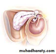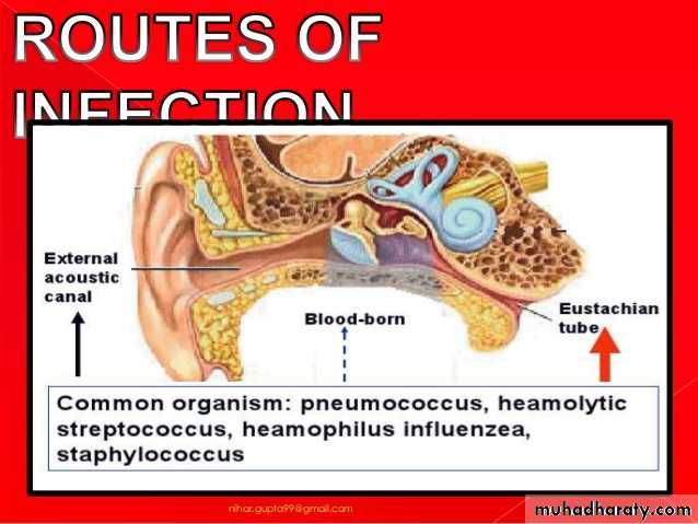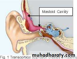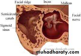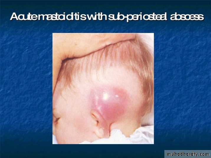 Exudation may be found in the mastoid process causes osteitis (mastoiditis)& erosion of the cortex >>>subperiosteal abscess