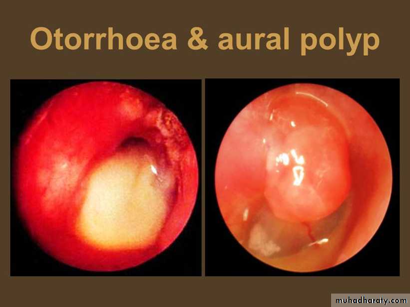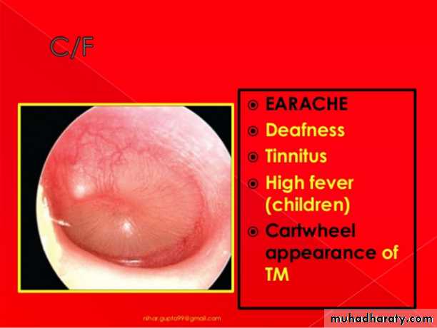 • Discharge ; often scanty mucoid, but becomes copious & purulent during exacerbation of U.R.T.I.• Conductive deafness