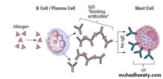 desensitization or hyposensitization, is a controlled injections of specific allergens to prevent reactions between allergen, IgE, and mast cells, by stimulate the formation of high levels of allergen-specific IgG that block or remove allergen from the system before it can bind to IgE, thus preventing the degranulation of mast cells.