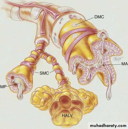 DMC, Degranulation of mast cell; HALV, hyperinflation of alveoli; MA, mucous accumulation; MP, mucous plug; SMC, smooth muscle constriction (bronchospasm)