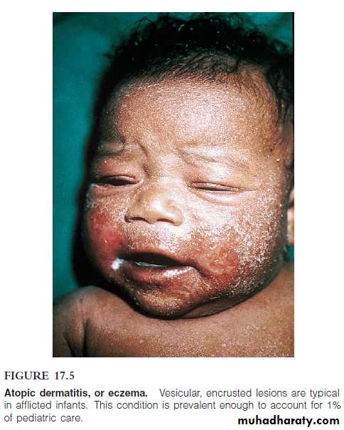It usually begins in infancy with reddened, vesicular, weeping, encrusted skin lesions.