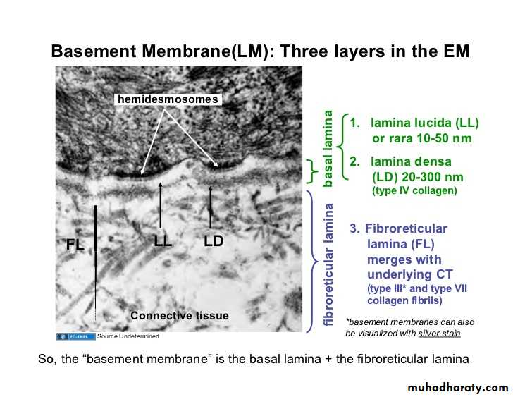 All epithelial tissues have at their bases a sheet like extracellular structure called the basal lamina.Under E.M. the basal lamina appears as dense layer 20-100 nm (10-9 meter)thick consisting of :