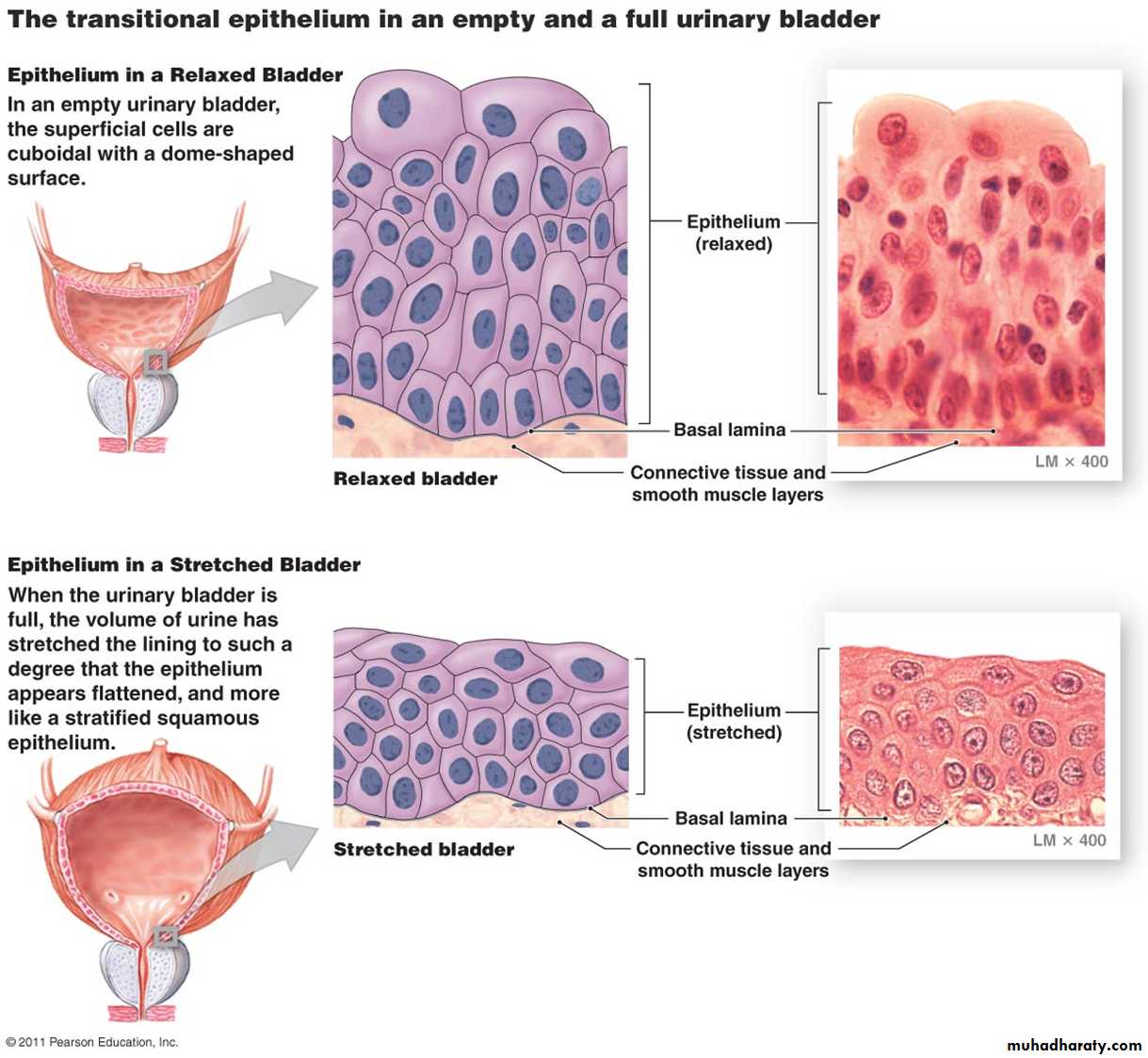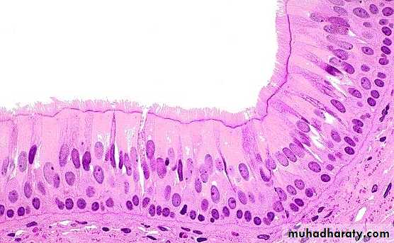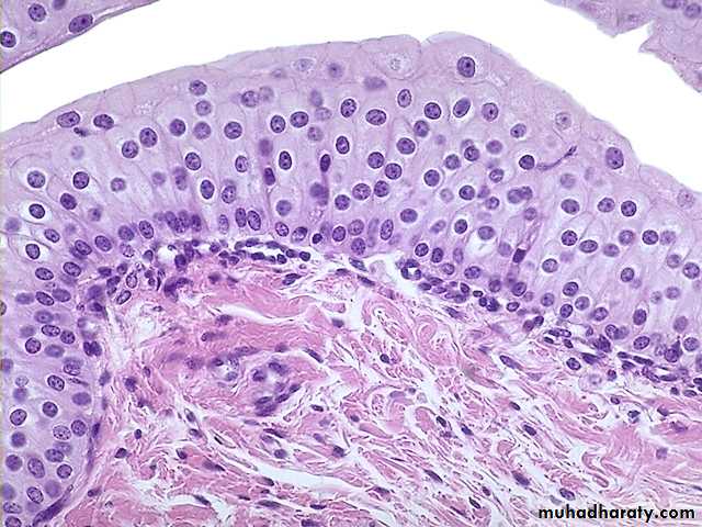 This epithelial type varies in appearance depending on the condition of the organ Fig (4). between stratified cuboidal and stratified squamous epithelia in the relaxed (contracted) state or (empty bladder),