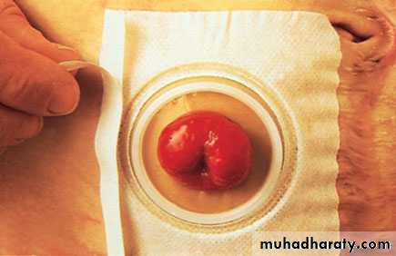 TreatmentPreoperative preparationRecent literature has suggested that no bowel preparation is safefor right-sided colonic surgery. The most commonly used methodis dietary restriction to fluids only for 48 hours before surgery; onthe day before the operation, two sachets of Picolax are taken to purge the colon. In addition, a rectal washout may be necessary. A stoma site is carefully discussed with the stoma care nursing specialist and anti-embolus stockings are fitted; the patient is started on prophylactic subcutaneous heparin, and intravenous prophylactic antibiotics are given at the start of surgery.