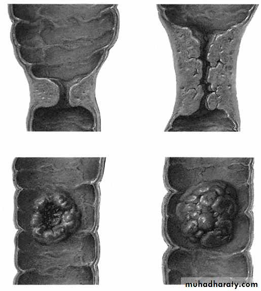 The annular variety tendsto give rise to obstructive symptoms, whereas the others will present more commonly with bleeding. Tumours are morecommon in the left colon and rectum.