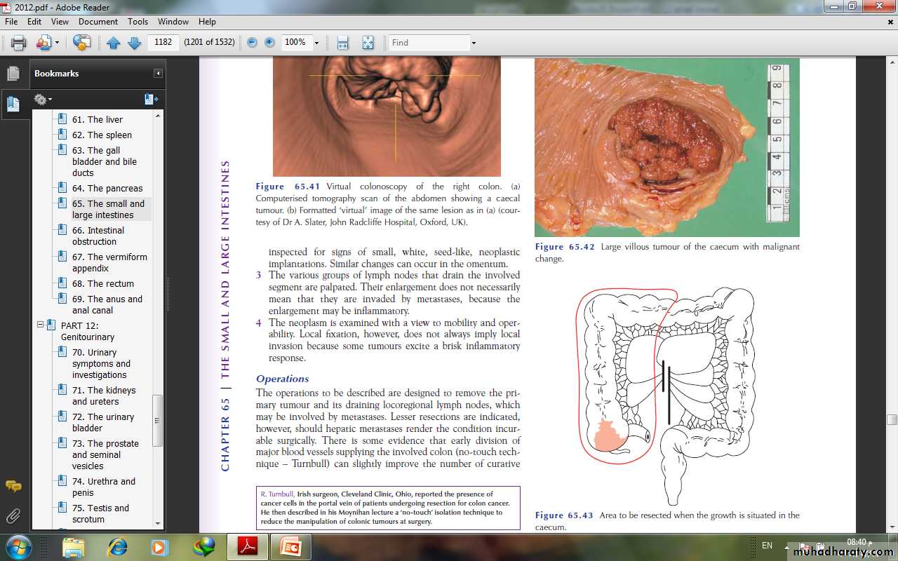 OperationsThe operations to be described are designed to remove the primary tumour and its draining locoregional lymph nodes, whichmay be involved by metastases. Lesser resections are indicated,however, should hepatic metastases render the condition incurable surgically. There is some evidence that early division ofmajor blood vessels supplying the involved colon (no-touch technique.