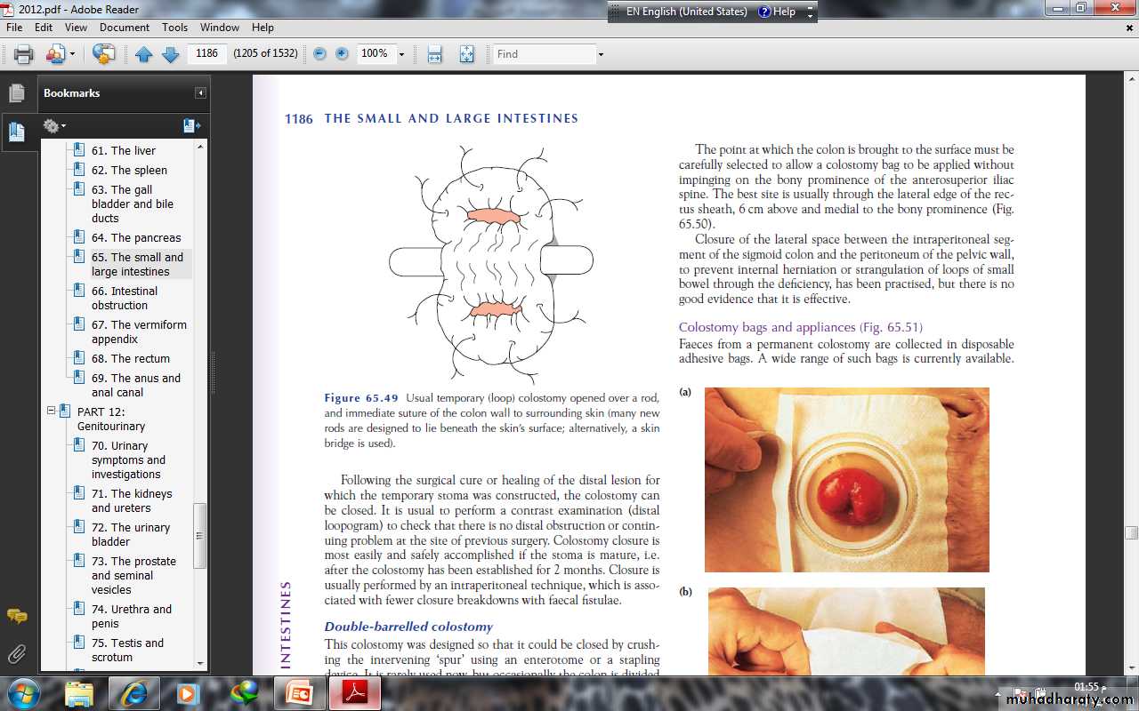 A temporary loop colostomy is made, bringing a loop of colonto the surface, where it is held in place by a plastic bridge passedthrough the mesentery. Once the abdomen has been closed, thecolostomy is opened. When firm adhesion of the colostomy to the abdominal wall has taken place, the bridge can be removed after 7 days. Colostomy closure is most easily and safely accomplished if the stoma is mature, i.e. after the colostomy has been established for 2 months.