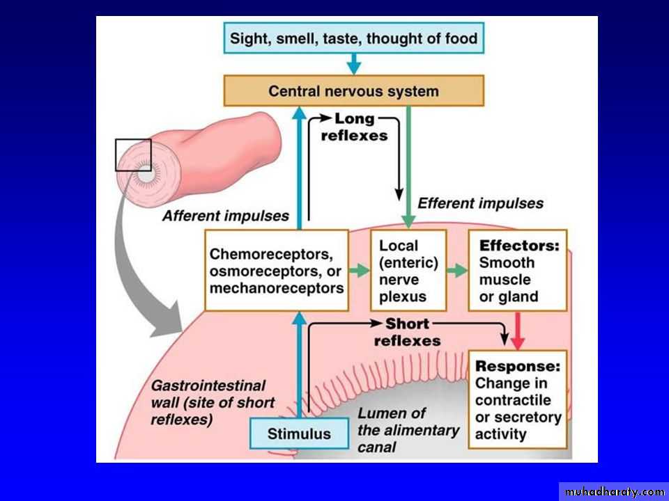 Reflexes that are integrated entirely within the gut wall enteric nervous system. These reflexes include those that control much gastrointestinal secretion, peristalsis, mixing contractions, local inhibitory effects, and so forth2. Short reflexes: