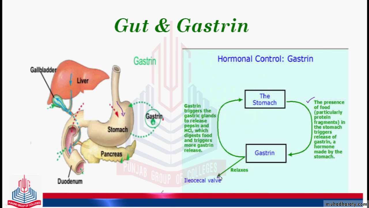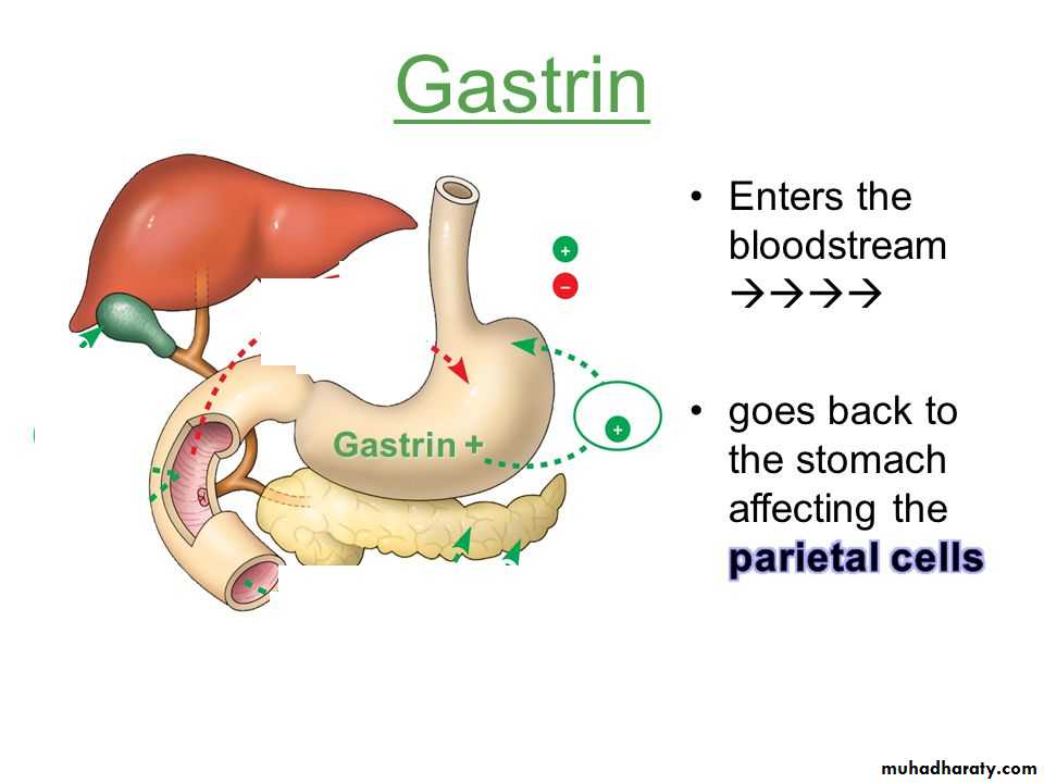 The gastrointestinal hormones are released into the portal circulation and exert physiological actions on target cells with specific receptors for the hormone. The effects of the hormones persist even after all nervous connections between the site of release and the site of action have been severedGastrin is secreted by the “G” cells of the antrum of the stomach in response to stimuli associated with ingestion of a meal, such as distention of the stomach, the products of proteins, and gastrin-releasing peptide, which is released by the nerves of the gastric mucosa during vagal stimulation. The primary actions of gastrin are (1) stimulation of gastric acid secretion and (2) stimulation of growth of the gastric mucosa.